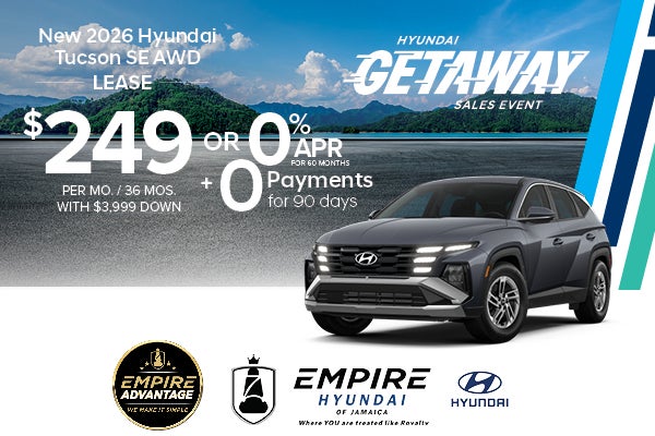 * For well qualified lessees approved by Hyundai Motor Finance, closed-end lease for a 2026 TUCSON SE AWD(85402A4S) is $249 per month for 36 months with $3,999 due at lease signing (excludes registration, tax, title, license, processing or documentation fees, insurance and any emission charge). Available from March 3, 2026 through March 31, 2026. Not all lessees will qualify. Higher lease rates apply for lessees with lower credit ratings. Offer shown based on $3,999 due at lease signing (includes $249 first payment and $3,750 capitalized cost reduction). No security deposit required. For well-qualified buyers on approved credit through Hyundai Motor Finance on new 2026 TUCSON SE AWD. At 0.00% Annual Percentage Rate (APR), payment for 60 months is $16.67 per month per $1,000 financed. No down payment required, other than any bonus cash requirements. Not all customers will qualify. Higher finance rates apply for buyers approved for credit with lower credit ratings. Subject to standard Hyundai Motor Finance credit approval guidelines and policies. MSRP of $30,950 for includes destination; excludes tax, license, title, registration, processing or documentation fees, insurance and any emission charge. If a qualified buyer defers payments for 90 days, the first scheduled monthly payment will be due 90 days from contract execution.