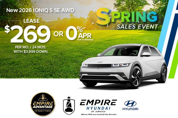* For well qualified lessees approved by Hyundai Motor Finance, closed-end lease for a 2026 IONIQ 5 RWD SE(51412REZ) is $269 per month for 24 months with $3,999 due at lease signing (excludes registration, tax, title, license, processing or documentation fees, insurance and any emission charge). Available from April 1, 2026 through April 30, 2026. Not all lessees will qualify. Higher lease rates apply for lessees with lower credit ratings. Offer shown based on $3,999 due at lease signing (includes $269 first payment and $3,730 capitalized cost reduction). No security deposit required. For well-qualified buyers on approved credit through Hyundai Motor Finance on new 2026 IONIQ 5 SE STANDARD RANGE. At 0.00% Annual Percentage Rate (APR), payment for 72 months is $13.89 per month per $1,000 financed. No down payment required, other than any bonus cash requirements. Not all customers will qualify.